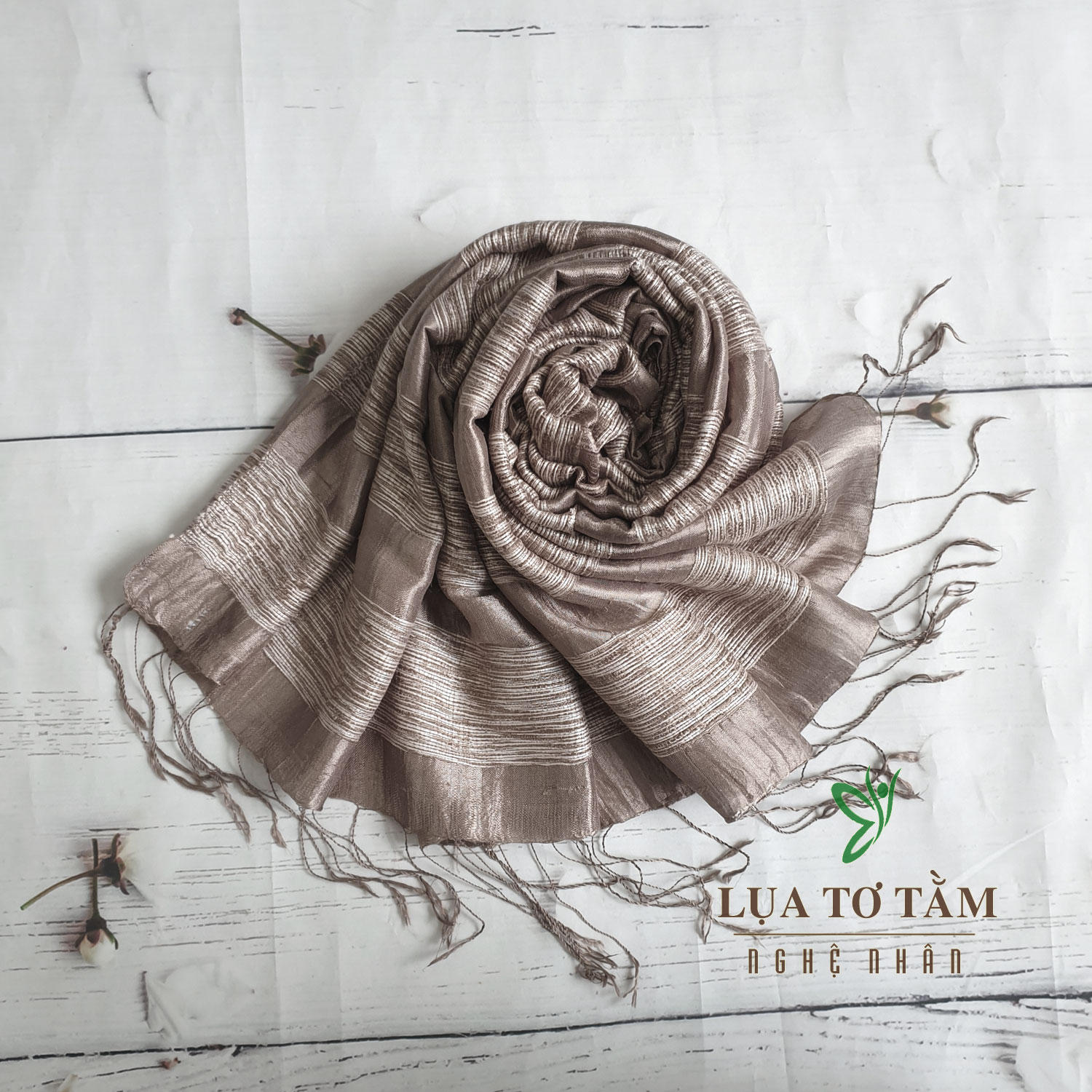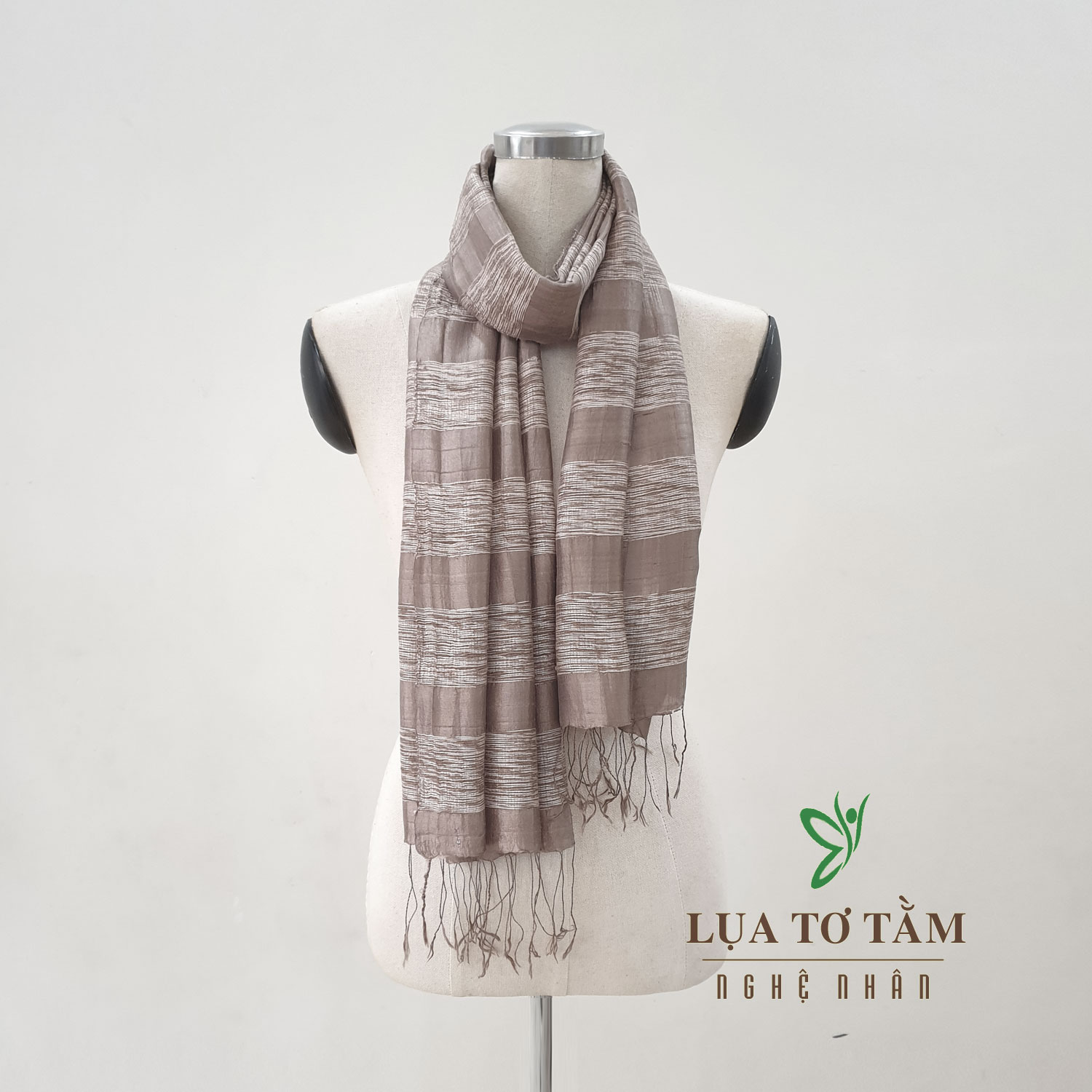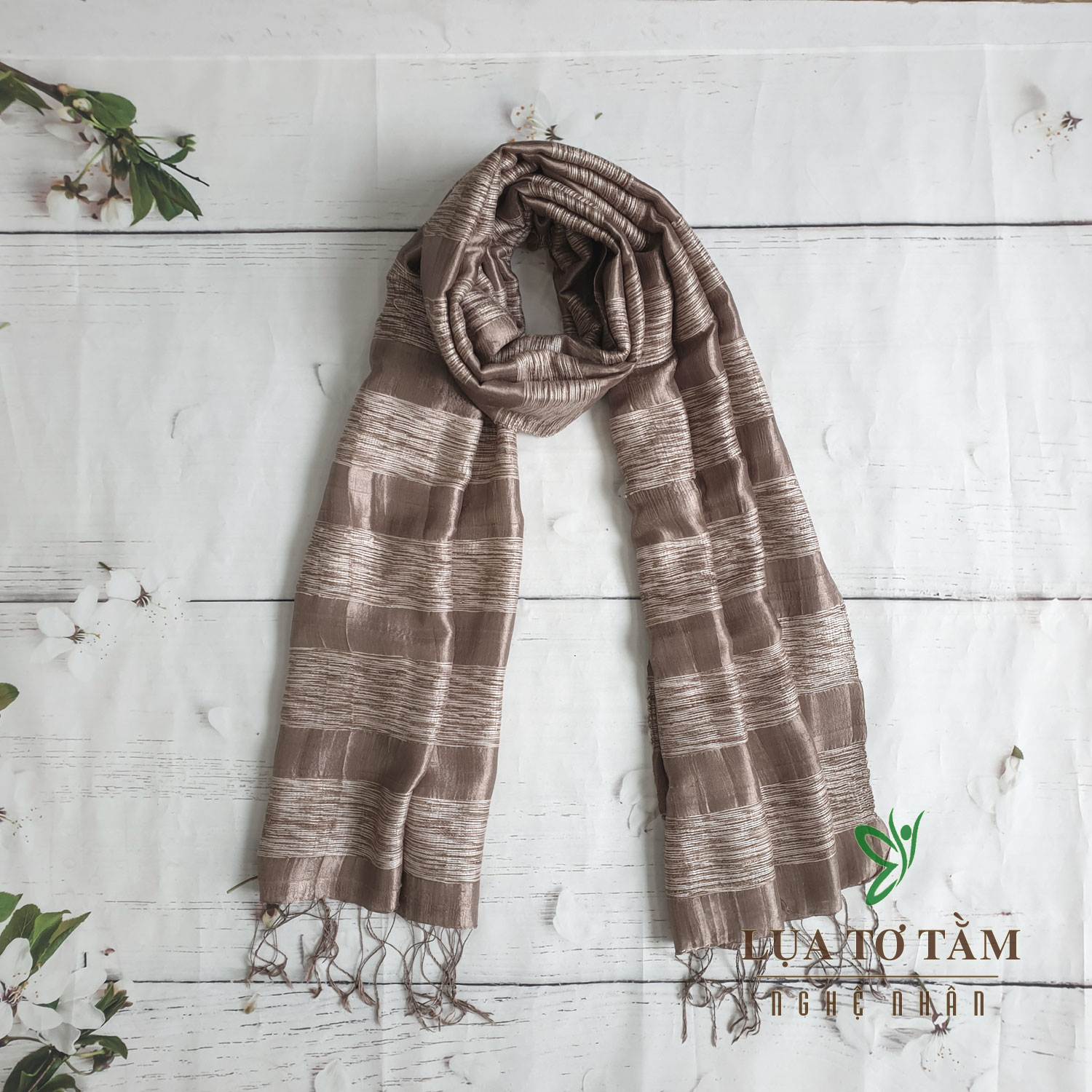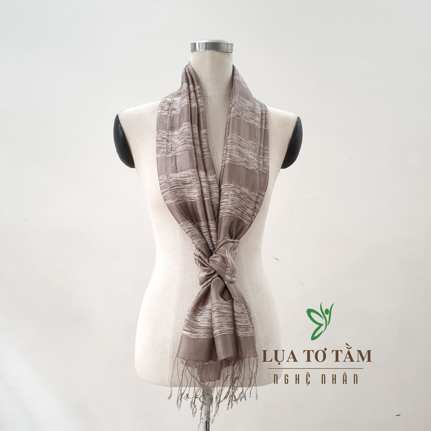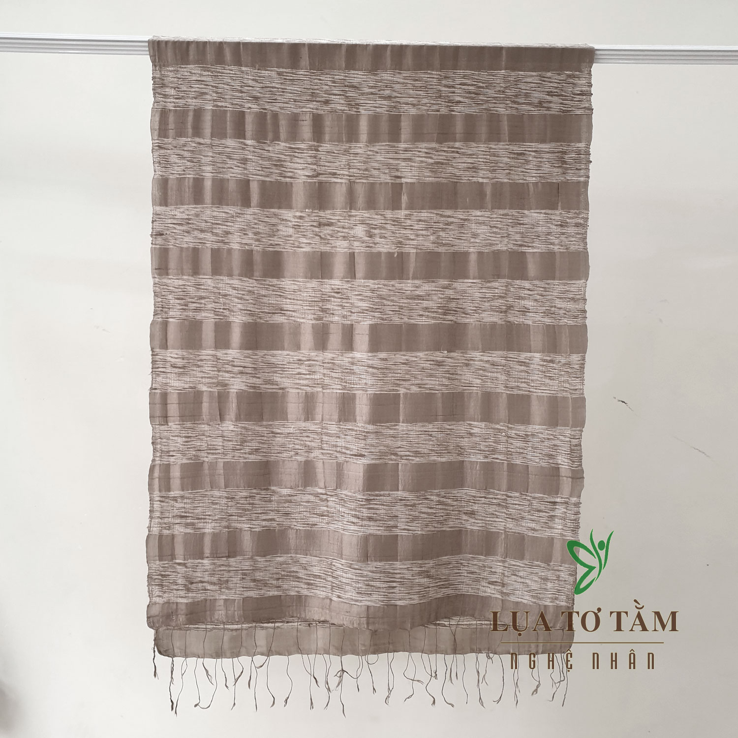 Khăn lụa tơ tằm dệt đố kẻ ngang kết hợp sợi tơ mịn ươm thủ công và sợi đũi tơ tằm, rất mềm và êm. Có thể dùng khăn quàng ấm mùa thu đông hoặc mùa xuân, cũng có thể choàng nhẹ mùa hè.