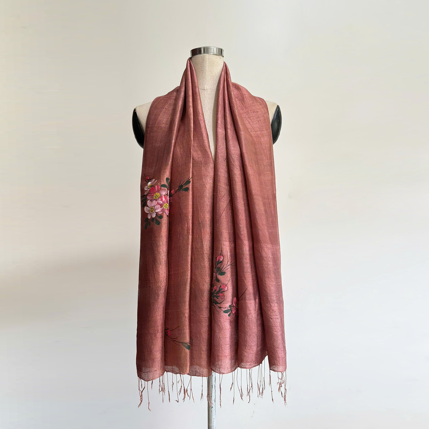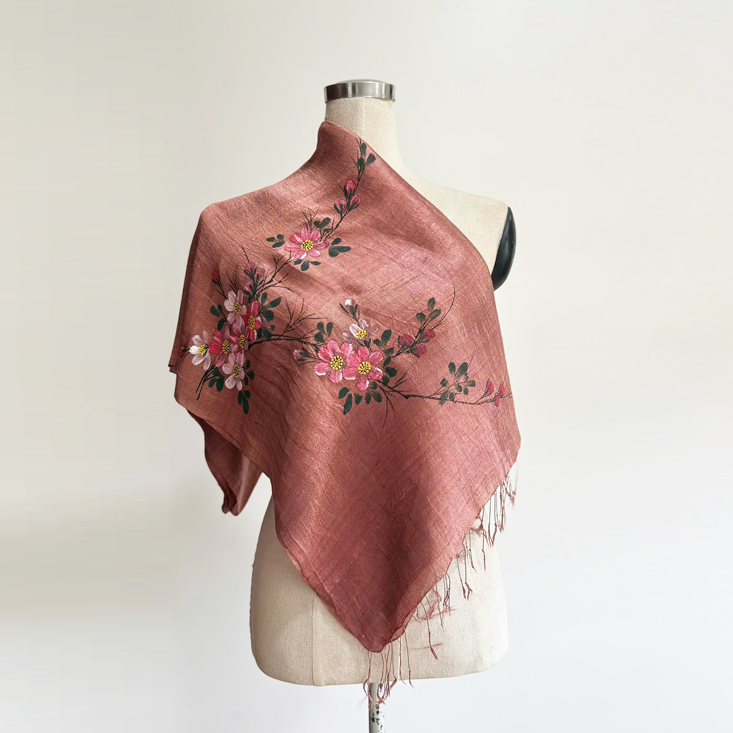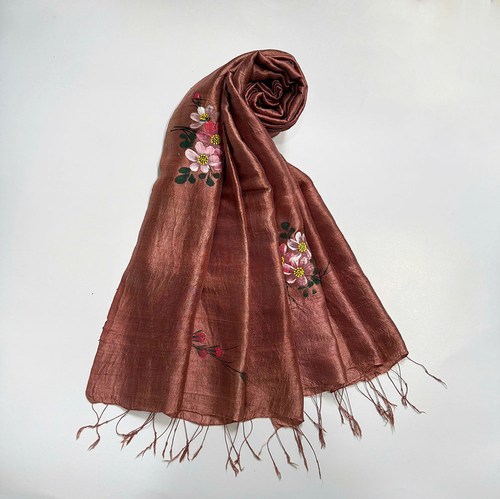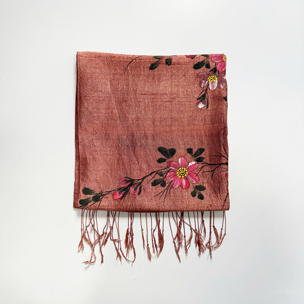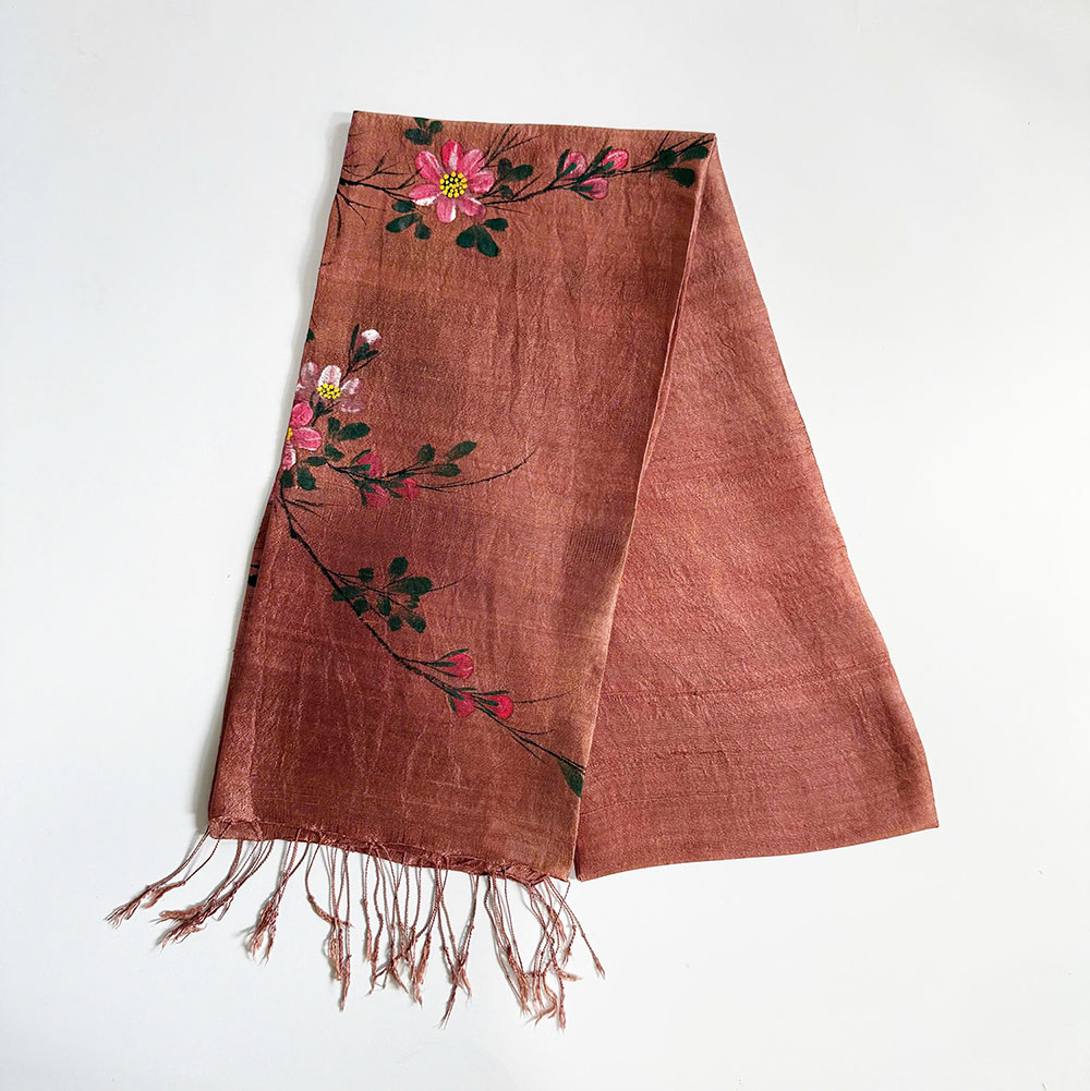 💦 Loại sản phẩm: Khăn lụa tơ tằm 100% Việt Nam vẽ hoa cỏ nền màu bã trầu.