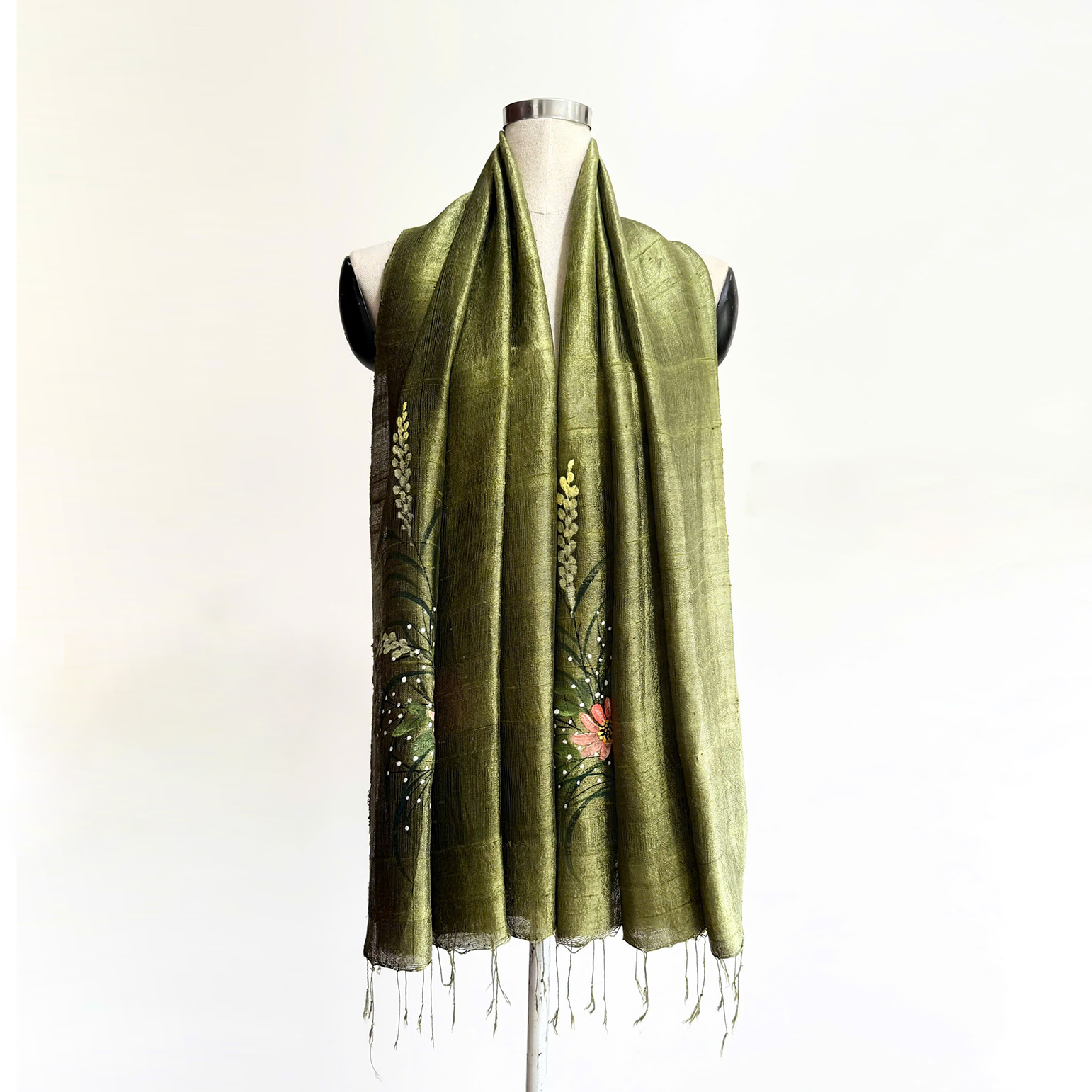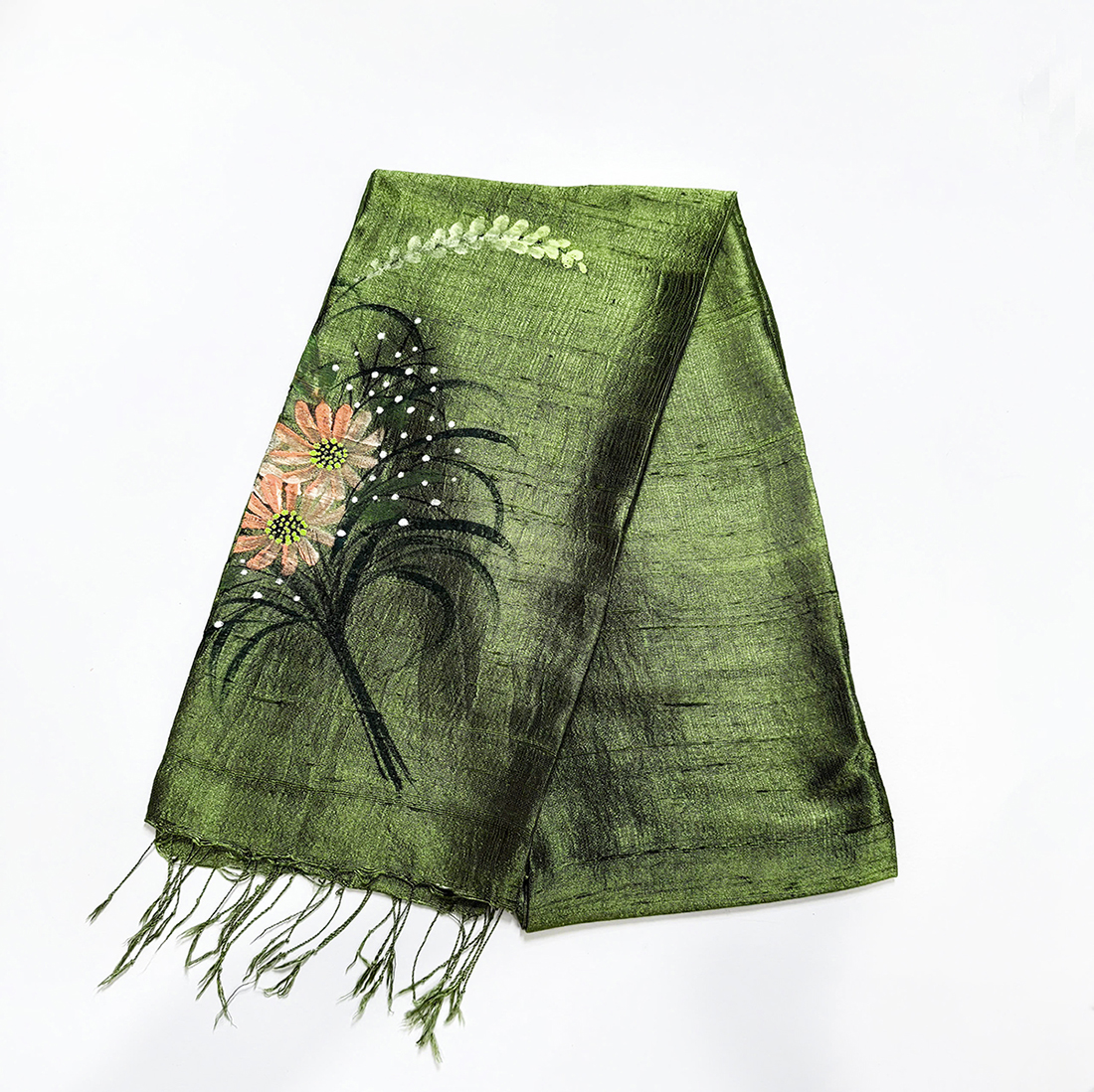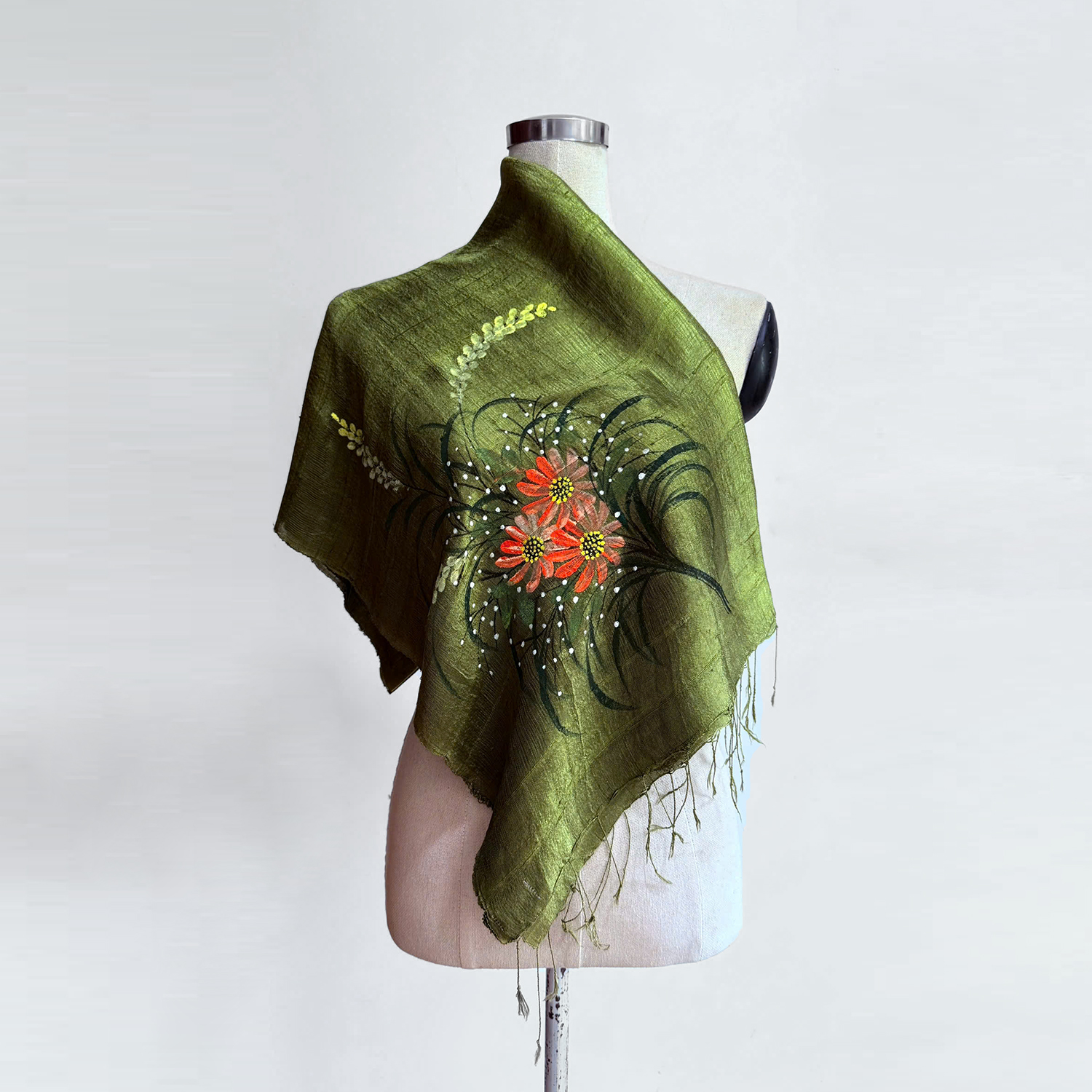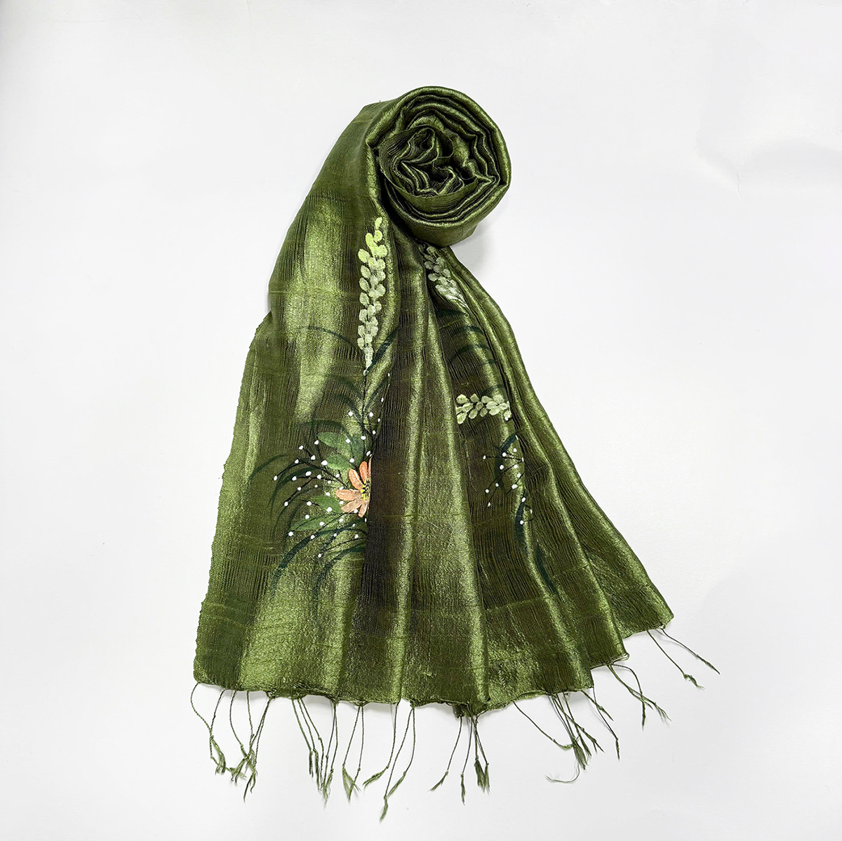 💦 Loại sản phẩm: Khăn lụa tơ tằm 100% Việt Nam vẽ hoa cỏ nền màu xanh olive.